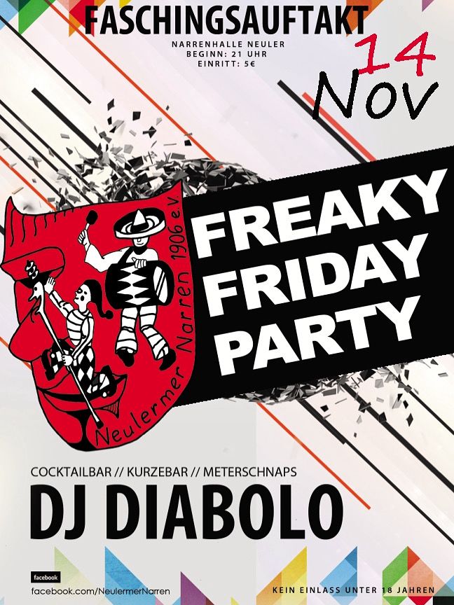 Und es geht schon wieder los! Die Faschingssaison 2026 steht vor der Tür und das wollen wir kräftig mit Euch feiern. Am Freitag, den 14.11.2024 findet deshalb die legendäre Freaky Friday Party in der „Narrenhalle“ statt.