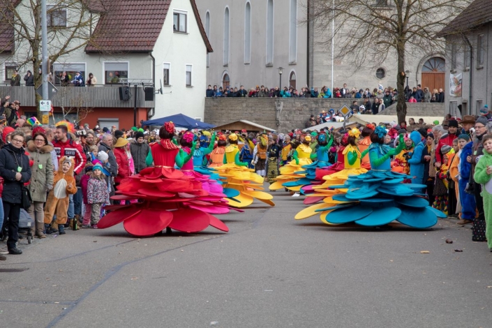 Am 3. März 2019 um 13.30 Uhr begann der Umzug. Er nahm seinen Weg wie in den vergangenen Jahren von der Fugger-, Haupt-, Schwenninger-, Hardt-, Sulzdorfer Straße, Klingenstraße, Hüttlinger Straße, Schmiedstraße bis zur Auflösung in der Hasenbergstraße.